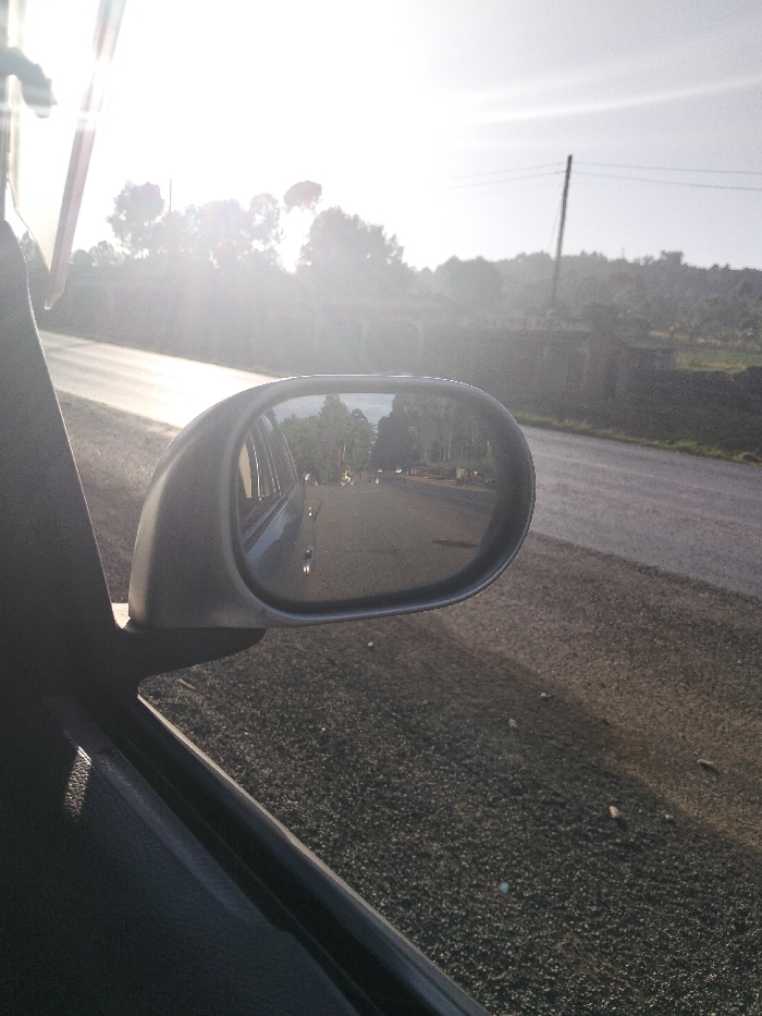 A car's side mirror captures a road stretching into the distance, lined with trees