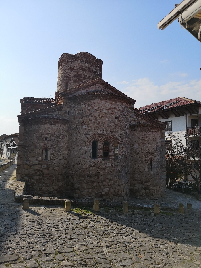 The image displays the exterior of the Church of St. John the Baptist, an ancient structure situated within the old town of Nesebar, Bulgaria. The church, occupying the central frame, is constructed from irregular light-colored stone blocks interspersed with courses of red brickwork. A prominent cylindrical brick tower with an arched top rises from the main body of the building. The church features terracotta roof tiles and several small, arched window openings in its stone and brick walls. In the foreground, a cobblestone street or plaza is paved with grey, irregular stones. A line of approximately six short, cylindrical, light-colored stone bollards is positioned along the edge of the church's base, with sparse green vegetation growing between the cobblestones and around the bollards. To the left of the church, a narrow cobblestone alley extends into the distance, bordered by traditional multi-story buildings characterized by white walls and dark roofs. To the right and slightly behind the church, a modern, multi-story building with white plastered walls, dark-tiled roofs, and balconies is visible. A deciduous tree with bare branches stands in front of this building, partially obscuring a dark metal fence or railing. The scene is illuminated by natural daylight under a clear blue sky with minimal cloud cover, casting distinct shadows on the cobblestones. No individuals, actions, or interactions are present within the depicted scene.