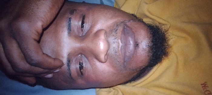 This image depicts an adult male located in what is identified as Sabon Tasha, Nigeria. The subject, of dark skin complexion, is shown in a close-up, horizontal orientation, with his head tilted slightly to the right from the viewer's perspective. He is lying down, with his eyes open or partially open. Prominent features include stubble on his chin and upper lip. The subject's right eye (viewer's left) exhibits periorbital swelling and reddish discoloration. His lips appear swollen and show a purplish discoloration, with his mouth slightly agape. A dark-skinned hand is positioned on the subject's left side (viewer's left), with fingers partially curled, resting near his jawline or cheek. He is wearing a yellow garment, likely a top, with a partially visible brown logo or text on the upper right chest area. A light blue fabric, possibly a pillow or bedding, is visible behind the subject's head in the upper left portion of the frame, indicating an indoor setting.