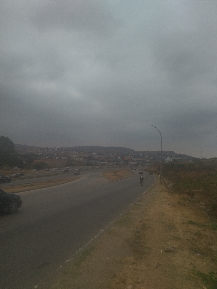 paved road with a slight curve. Several vehicles are visible in the distance on the road, including a black car on the left side of the image in the foreground. Several people are riding motorbikes on the road. The scene is overcast with gray clouds. The image appears to be taken from a vantage point on the side of the road. The image was taken in Aso, Nigeria at the coordinates 9.043, 7.54. A streetlight with a single bulb is visible on the right side of the image.
