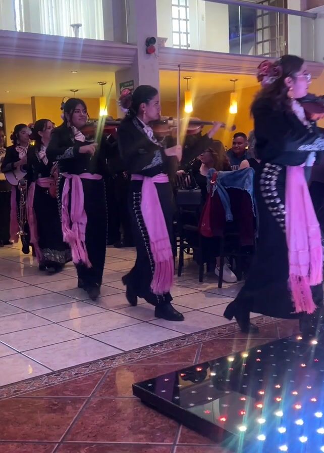 A group of people dressed in matching black charro suits with pink sashes walk in procession across a tiled floor at an indoor venue. They are playing musical instruments including violins, guitars, and trumpets. The venue appears to be a reception hall, with tables of seated guests visible in the background. A raised stage platform with colorful lights sits in the foreground. A man in a black shirt and pink tie walks past them. There is an exit sign hanging on the wall.