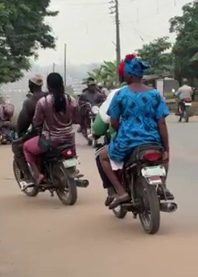 street scene with multiple motorcycles moving in the same direction. Most motorcycles carry two passengers. The riders and passengers have diverse clothing. A white SUV is among the vehicles on the road. A sign for the Independent National Electoral Commission is visible. Trees line the street. The sky is overcast.