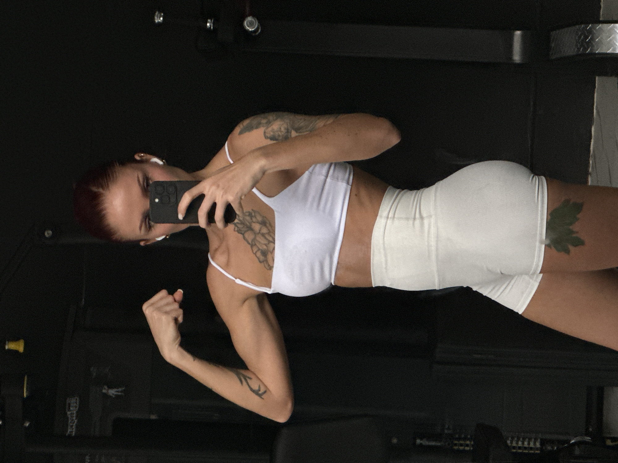 The image captures a female individual posing for a mirror selfie within an indoor gym setting in Kerobokan, Indonesia. She has reddish-brown hair pulled back, wears a white spaghetti strap crop top, white high-waisted ribbed athletic shorts, white wireless earbuds, and small gold hoop earrings. Her right hand holds a black smartphone, partially obscuring her face, while her left arm is flexed at the bicep. Visible tattoos include a large floral design on her left chest/shoulder, an abstract pattern on her inner left bicep, a winged figure on her right upper arm, and a green leaf-like design on her right upper thigh. The background consists of dark, solid walls, with minimal, indistinct gym equipment features visible, such as a small white stick figure decal on the upper left and a metallic textured panel on the lower right.