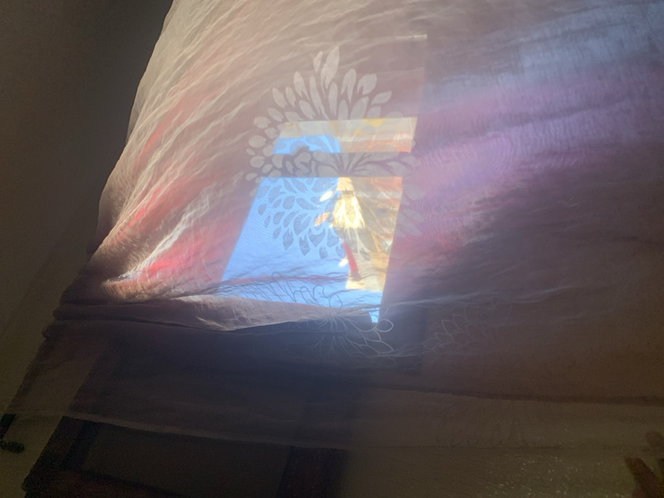 An interior scene in Casablanca, Morocco, depicts a sunlit window partially obscured by a translucent, light-colored curtain. The sheer or semi-sheer curtain, displaying a subtle floral or abstract botanical pattern, is gathered at the top and suspended from a dark curtain rod visible in the upper left. Strong natural light penetrates the curtain, creating areas of reddish-pink and blue illumination, along with subtle prismatic effects on the fabric. Through an uncovered or highly illuminated rectangular section of the window, a bright blue sky with diffuse cloud formations or distant foliage is visible. Below the sky, a section of a sun-drenched exterior building is seen, featuring yellowish-gold surfaces and distinct reddish-orange architectural elements, possibly rooftops or awnings. The immediate interior foreground, particularly the lower-left corner, remains comparatively dim, revealing a faint, indistinct shape consistent with a human hand. No individuals are clearly discernible.