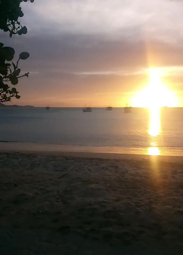 sunset over a calm sea with several boats silhouetted on the horizon. The sun shines brightly, creating a reflection on the water's surface. The foreground is a dark sandy beach. The sky is partly cloudy with shades of gray and orange. The video is shot from a stationary position.