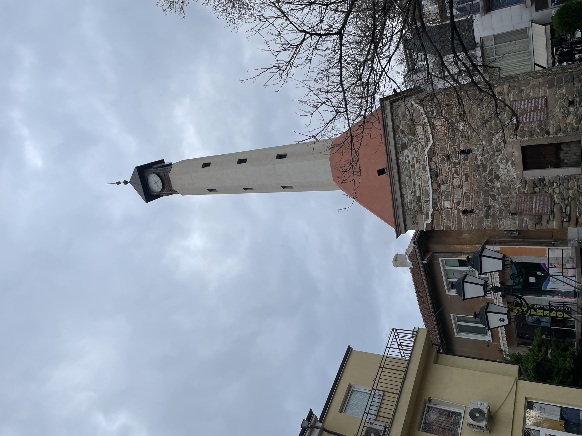 Pazardzhik Clock Tower in Pazardzhik, Bulgaria, taken from a low angle looking upwards. The tower is tall and slender, with a clock face at the top and a light-colored shaft featuring small windows. It is connected to an older stone structure with a red section at the top. The sky is overcast. Bare tree branches are visible near the top of the frame. Adjacent to the clock tower are several buildings with different colors and architectural styles, including a yellow building with a fire escape and a building with a lamp post in front of it.