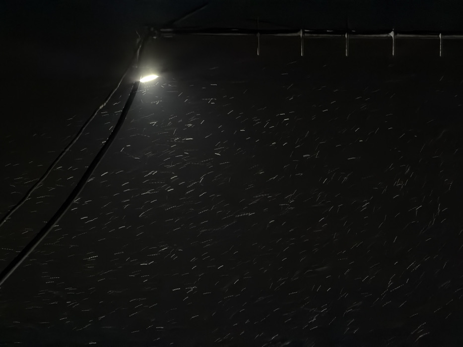 A dimly lit, night scene depicts snow falling. A streetlight illuminates the left side of the image, highlighting the falling snow. Power lines run diagonally from the light source towards the top left. Above the light and slightly to the right, a horizontal bar with several vertical supports is visible. The majority of the frame is dark, capturing the blizzard-like conditions.