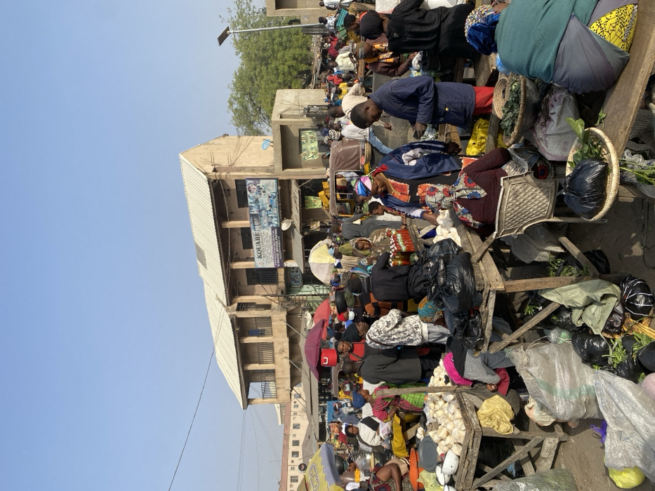 A crowded outdoor market bustles with activity. People are shopping, selling goods, and moving through the narrow spaces. Various vendors display their wares on tables and blankets, including produce, clothing, and household items. A multi-story building overlooks the market, its façade showing signs of age. A clear sky and a few trees are visible in the background.