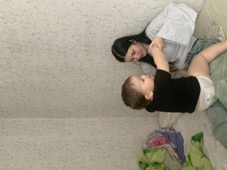 The image depicts an indoor scene within a residential room in the city of Фоки, Russia. An adult female, characterized by long dark hair and wearing a light grey long-sleeved top with wide cuffs and light blue denim shorts, is seated on a bed. A toddler, with light brown hair, dressed in a black t-shirt and a soiled white disposable diaper, is seated on her lap. The female and child are holding hands, looking at each other, with the female displaying a slight smile. To the left, a pile of bedding, including a green patterned duvet and a purple textile, rests on the bed. The walls are covered in light-colored, textured wallpaper, and a wall corner is visible in the background. The lighting is ambient.