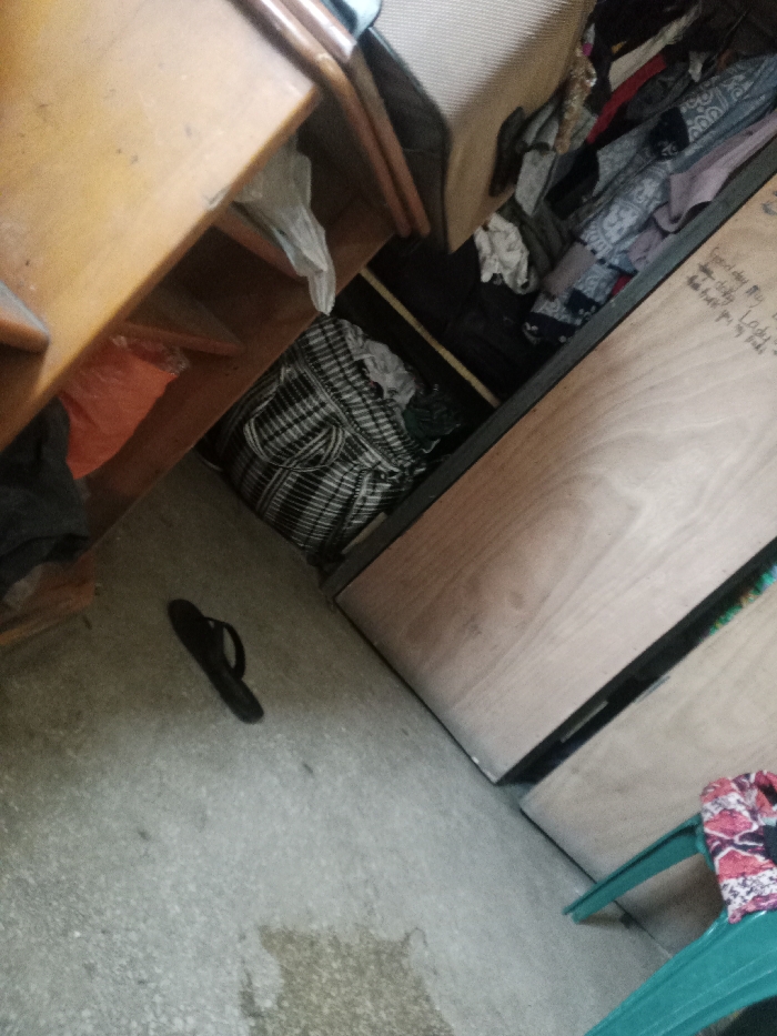 This image depicts an interior space within the city of Agani, Nigeria. The scene is observed from a slightly elevated, tilted perspective, showcasing a cluttered room. The floor is concrete, displaying areas of discoloration and moisture stains. On the left, a light brown wooden shelving unit or desk is visible, containing a white crumpled plastic bag on an upper shelf and an orange plastic bag on a lower shelf. Below this unit, a dark fabric item rests on the floor. A single black flip-flop lies flat on the concrete floor, positioned centrally towards the left. On the right side of the frame, a wooden panel, likely part of a wardrobe or storage unit, extends diagonally. Handwritten text in a dark marker is visible on this panel, including phrases like "Good day My," "Good day Lady," and "with you my God." Behind this panel, an open compartment reveals a collection of assorted clothing items and fabrics, some folded, some rumpled. A black and white plaid bag or container is discernible within this compartment. At the lower right corner, a portion of a green plastic chair is visible, draped with a red and white patterned cloth. The overall environment suggests a lived-in, somewhat disorganized setting. No individuals or active interactions are present.