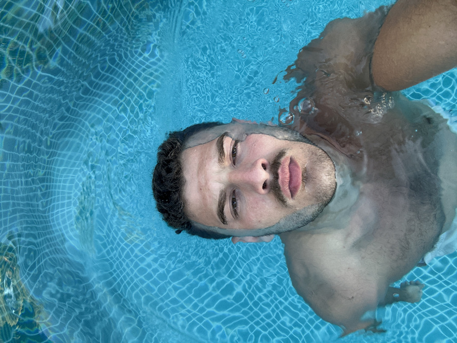 A man is seen in a pool with blue tile. The individual is nearly submerged, with only his face, one arm, and parts of his chest visible above the water. He has dark hair, light skin, and a beard. The image is taken from above, showcasing the clear blue water and the man's relaxed expression. There are some ripples on the water's surface.