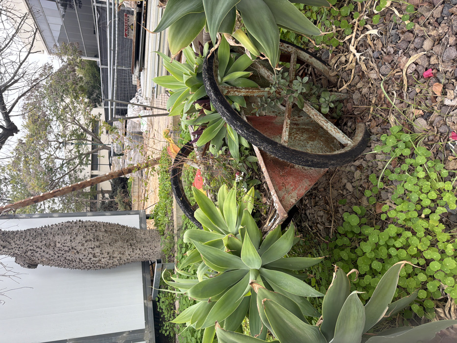 This image depicts an outdoor scene in the Eshkol Regional Council, Israel, characterized by vegetation and construction elements under an overcast sky. In the immediate foreground, a heavily rusted, red metal wheelbarrow, devoid of handles and with two large, spoked wheels, lies on its side, repurposed as a planter. Several mature Agave attenuata plants, with smooth, pale green leaves, are growing from within and around the wheelbarrow. Other smaller green plants, including a patch of ground cover with circular leaves, are present. The ground consists of dark gravel and small stones. In the mid-ground, to the left, a tall, stout tree trunk with numerous prominent spines is visible next to a white, vertical temporary structure, possibly a construction trailer. To the right of the tree and trailer, a disturbed area suggests ongoing construction or landscaping, with stacks of building materials (likely wood planks or sheet metal) and sections of chain-link fencing visible. A multi-story building with dark, reflective windows is in the far background on the right, partially obscured by trees and foliage. The overall environment appears to be an urban or peri-urban transitional zone, possibly a neglected area adjacent to active development.
