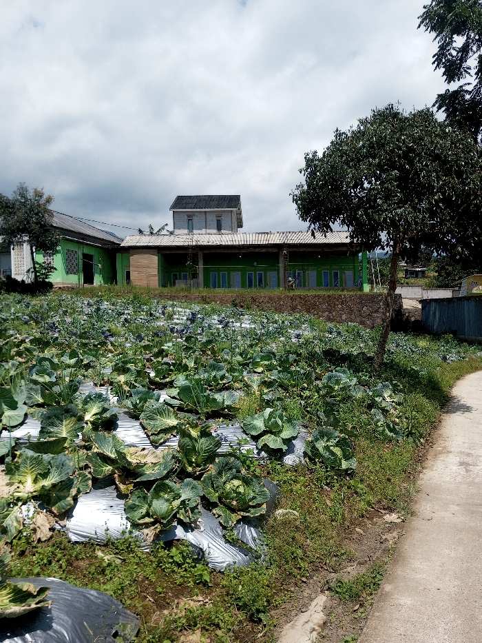 The image depicts an agricultural scene in Tagtse Tashidingkha, Bhutan, under a cloudy sky. In the foreground, a field of green cabbage plants, many with mature heads, is cultivated in rows, with the soil beneath covered by reflective plastic mulch. A narrow, unpaved path runs along the right edge of the field, curving into the distance. A mature deciduous tree with dense green foliage stands beside this path, casting a partial shadow. In the midground, behind the cabbage field, a stone retaining wall supports an elevated area where several buildings are situated. The most prominent building is a long, single-story structure painted bright green, featuring multiple uniformly spaced windows with dark frames. To its left, another light-green building section is visible. Above and behind this central green building, a taller, multi-story structure with grey roofing and unpainted concrete or brick walls is partially visible, appearing unfinished. No individuals, specific actions, or direct interactions are visible. The overall environment suggests a rural or semi-rural agricultural community.