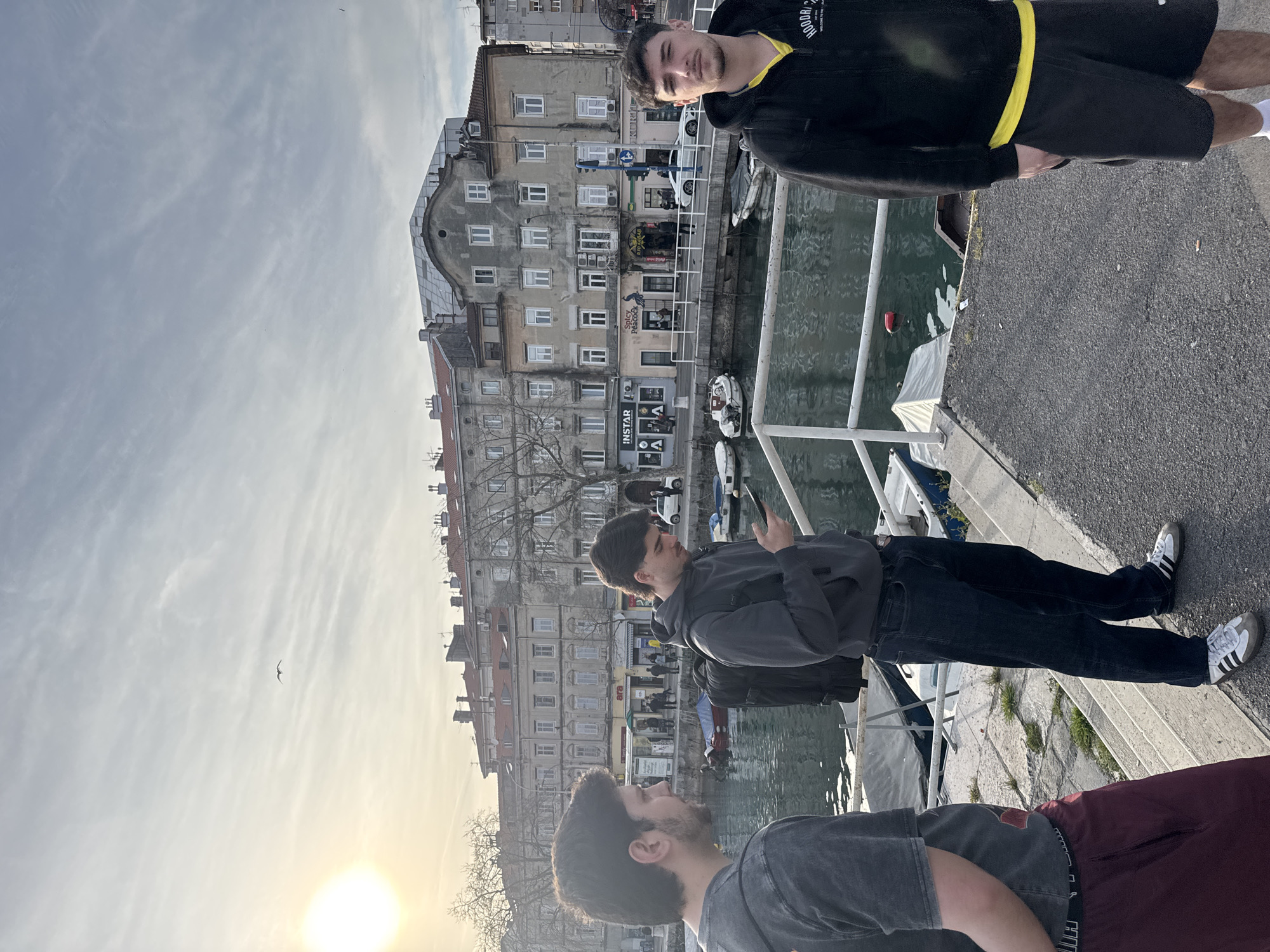 The image presents an urban waterfront scene in Grad Rijeka, Croatia, under a partly cloudy sky with the sun positioned low on the left. In the immediate foreground, three young adult males are visible on a concrete and asphalt promenade featuring a white metal railing. The male on the far left, partially cropped, wears a grey short-sleeved shirt and maroon athletic shorts/pants, looking towards the right. The central male, slightly behind the first, wears a grey hooded sweatshirt, dark blue jeans, and white sneakers with black stripes, holding and looking down at a smartphone; a black backpack is on his back. The male on the right, standing on a lower section of the promenade, wears a black hooded sweatshirt over a yellow t-shirt and black shorts; he faces the viewer directly. The promenade borders a body of water, likely a canal or harbor section, where multiple small boats are moored, some covered with tarpaulins. Across the water, a street is visible, populated by pedestrians and at least one white car. Beyond the street, a sequence of multi-story buildings forms the city backdrop. These structures exhibit varying architectural styles and degrees of wear. Ground-level commercial establishments are identifiable, including signs for "INSTAR," "Spicy Peacock," "BIO KEBAB," and "KURÜ." Leafless trees line the distant street. A single bird is in flight in the upper left quadrant of the sky.