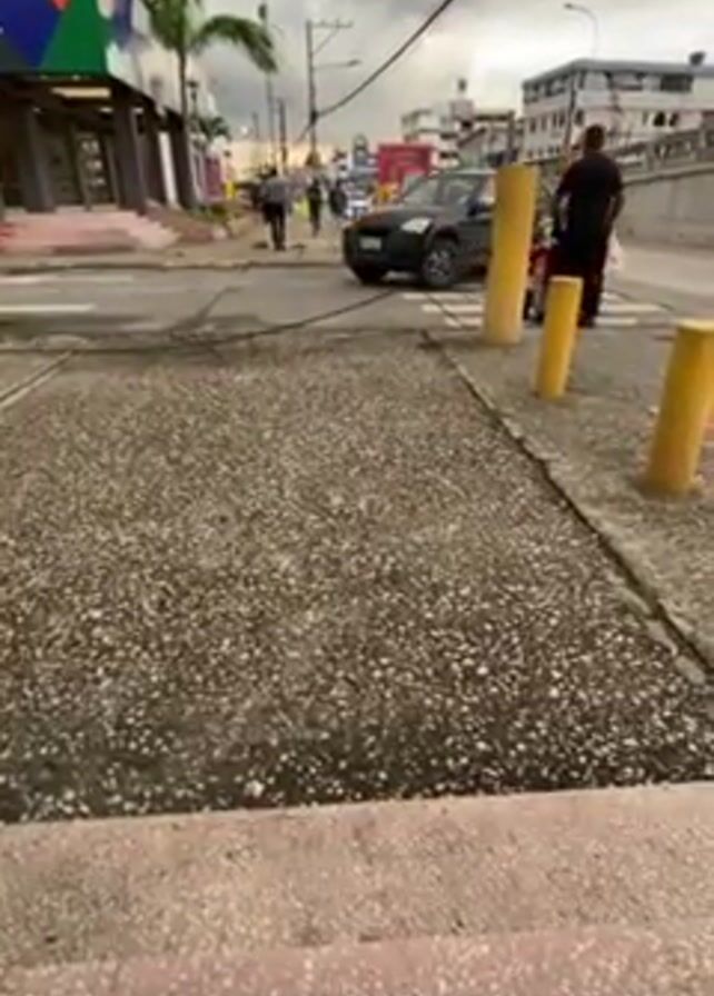 The video is taken from a ground level viewpoint, looking out over a city street. The camera appears to be on a raised platform, as the edge of a step is visible at the very bottom of the frame. The foreground consists of a grey textured concrete surface. In the middle distance is a crosswalk with several people crossing the street. A dark pickup truck is stopped in the crosswalk, waiting for the pedestrians to pass. To the right of the crosswalk are several yellow bollards. A man wearing black clothing is pushing a red shopping cart, also crossing the street. On the left side of the frame is a brightly colored storefront. A palm tree is situated near the building. Above the street, power lines crisscross the sky. In the far distance, several buildings are visible. The sky is overcast, creating a diffused lighting effect.