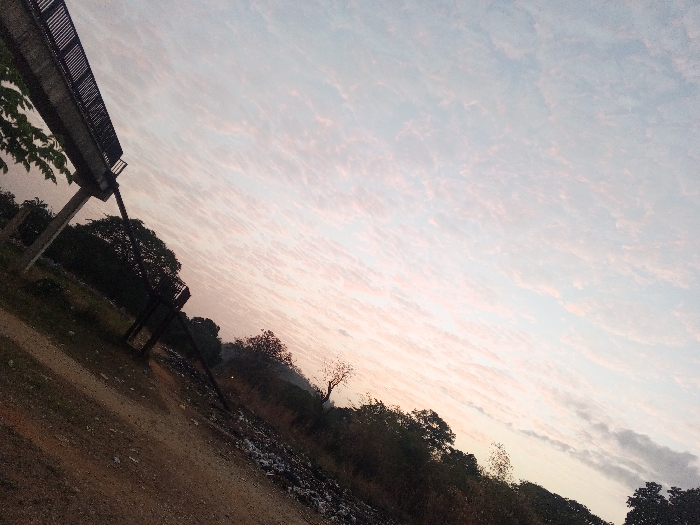 - "An outdoor scene in Tinaquillo, Venezuela, is depicted with a notable counter-clockwise tilt, likely under dawn or dusk conditions, given the sky's light blue, pink, and white altocumulus cloud formations" by FM-qIUX02, licensed under CC BY 4.0