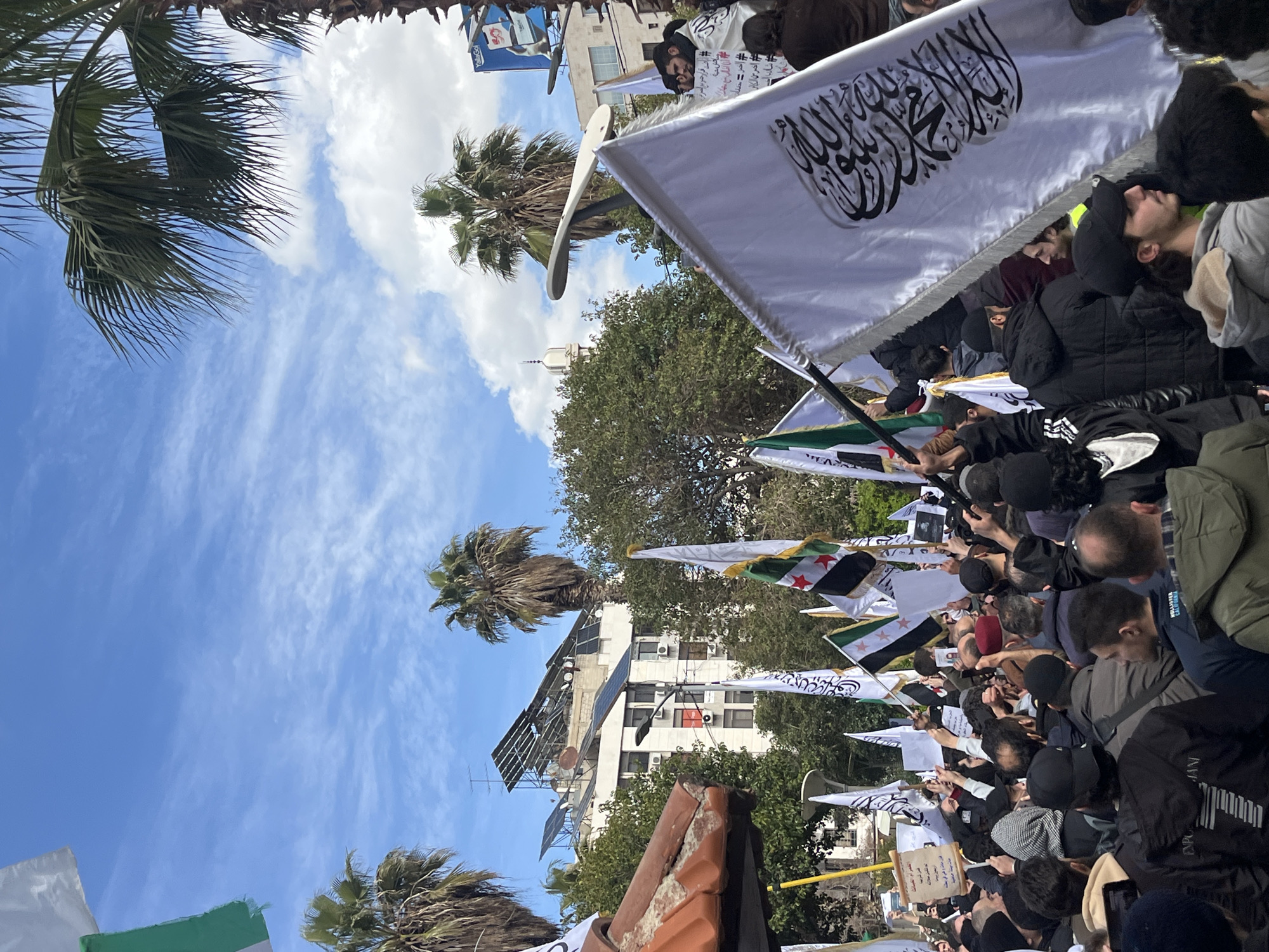 A large outdoor gathering is depicted in Al-Muhajerin Municipality, Syria, under a partly cloudy blue sky. A dense crowd of individuals, predominantly adult males, occupies the lower and mid-ground, holding numerous flags and signs. The flags include multiple white banners featuring black Arabic calligraphy, likely the Shahada, and several flags of the Syrian opposition, characterized by green, white, and black horizontal stripes with three red stars. Some flags incorporate green and white elements. Individuals are holding white placards with black Arabic text, with one sign partially visible on the left and another person in the background wearing a white cloth with Arabic writing. The environment includes several tall palm trees with green fronds, visible throughout the scene, and other green deciduous trees. In the background, a multi-story white building with windows and air conditioning units is prominent, its rooftop equipped with numerous solar panels angled towards the sky and an antenna array. A street light fixture is present in the mid-ground. To the upper right, a billboard displaying "YallaGol" and a phone image is partially visible. A distant minaret, indicating a mosque, can be seen on the horizon. A reddish-brown tiled roof structure is in the lower-left foreground. The crowd appears to be actively participating in a demonstration or rally, with individuals dressed in varied casual attire, including jackets, hoodies, and caps.