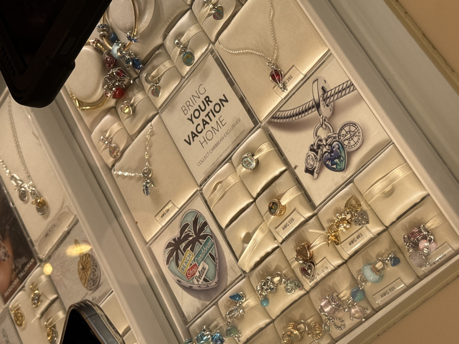 A display case showcases Pandora jewelry, particularly charms and necklaces. A sign reads, "Bring Your Vacation Home. Collect Caribbean Exclusives!" Heart-shaped charms with a beach theme are visible. Various other charms are presented in individual compartments with ribbons. Items are labeled with codes like "AWG 225," "AWG 492," "AWG 321," and "G 252." A charm bracelet with multiple charms, including a compass, is featured.