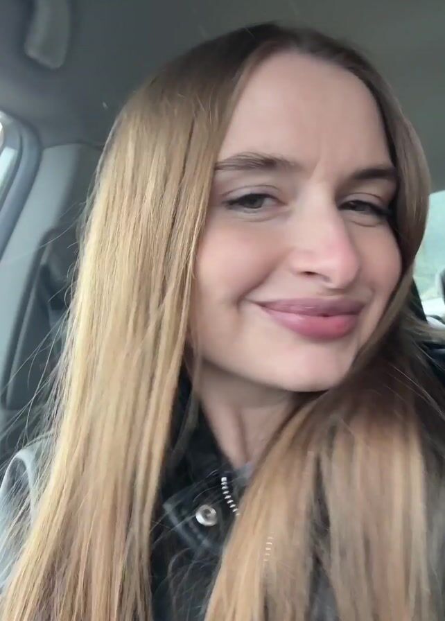 woman in the driver's seat of a car, singing along to music. She has long, blonde hair and is wearing a black leather jacket. She smiles and squints playfully at the camera. The interior of the car is visible in the background.