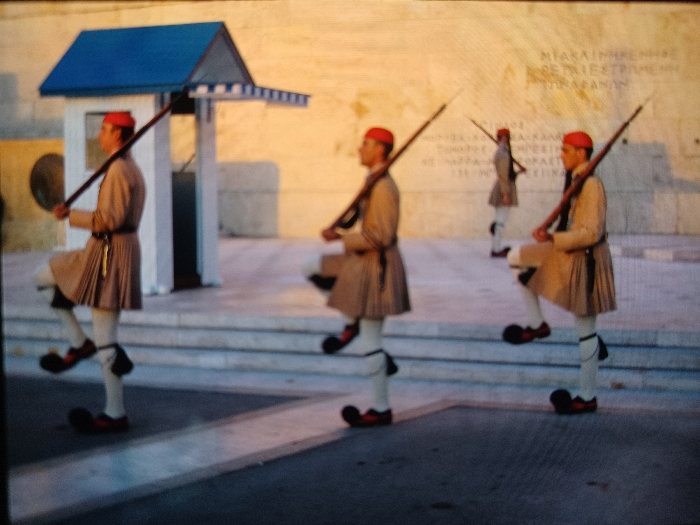 - "Four Evzones of the Presidential Guard are captured in a synchronized ceremonial march at the Tomb of the Unknown Soldier, located in front of the Hellenic Parliament building in Syntagma Square, Athens, Greece" by FM-b94Yk2, licensed under CC BY 4.0