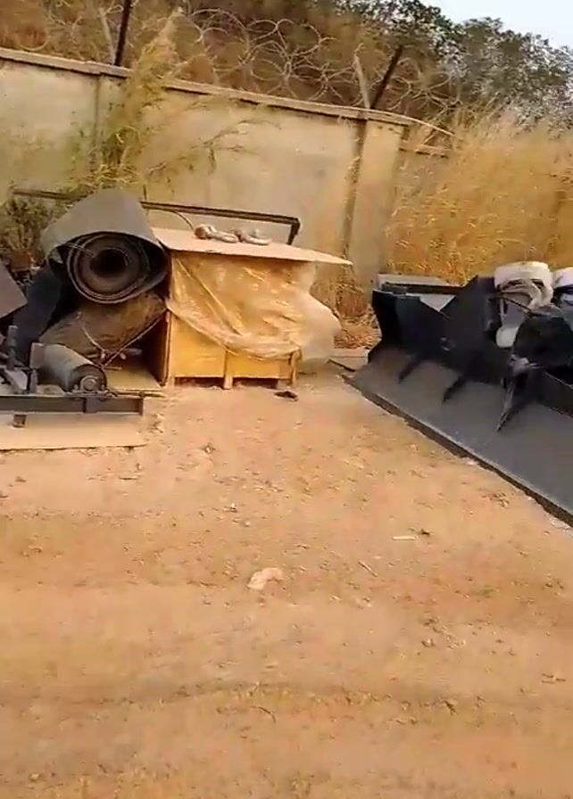 The video depicts an outdoor scene with various metal components and structures scattered on a dirt surface. There's a concrete wall with barbed wire along the top and tall grass in the background. The metal components include what appears to be parts of machinery or equipment, some stacked and some lying flat on the ground. A wooden crate is also visible. The video pans across the scene, showing the arrangement of these objects in relation to the wall and the surrounding environment. The lighting is somewhat overcast, and the overall impression is of an industrial or storage area. There are no people visible in the video.