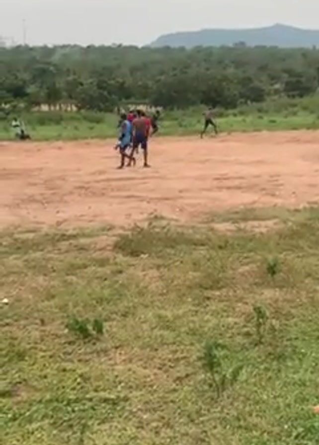 A wide shot captures a group of around ten individuals playing soccer on a dirt field surrounded by green grass and vegetation