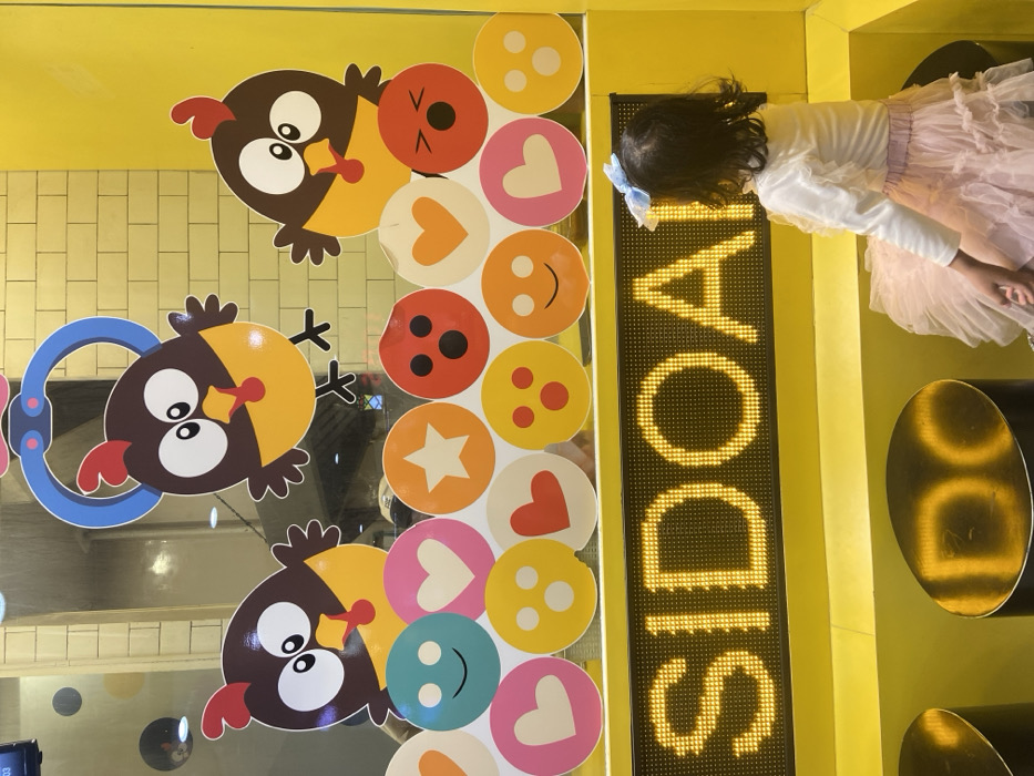The image depicts an interior scene within a commercial establishment in Sidoarjo, Indonesia. A young child, observed from the back, is seated on a dark, cylindrical stool. The child has dark hair with a light blue bow, wears a white long-sleeved top with ruffled shoulders, and a light pink tiered tulle skirt. The child is facing a yellow display wall. The display features a prominent illuminated LED sign at the child's eye level, exhibiting bright yellow text that reads "SIDOARJ" (implying "SIDOARJO"). Above this sign, two horizontal rows of circular stickers are affixed. These stickers are multicolored and display various emojis and symbols, including happy faces, hearts, stars, and distressed faces. Further above these stickers, on what appears to be a glass window or panel, three cartoon chicken decals are present. These stylized chickens are brown with yellow undersides, red combs, and large white eyes. One chicken, centrally located, holds a blue ring-shaped object. The background visible through the glass exhibits light yellow square tiles. A second dark, cylindrical stool is partially visible on the left side of the frame. The immediate foreground and display structure are predominantly yellow.