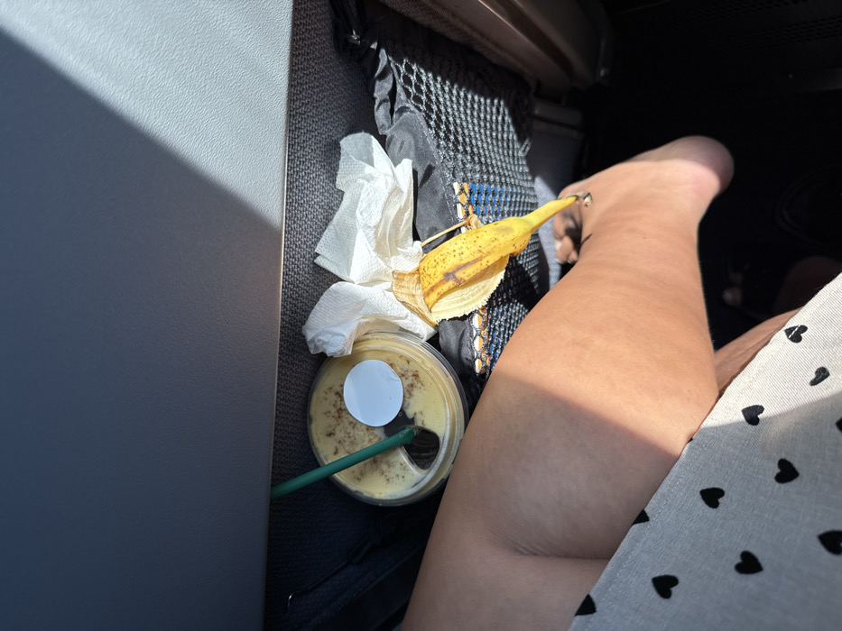 The image depicts the interior of a commercial transport vehicle, likely an aircraft, within the geographic context of Newark, United States. A person's bare upper right thigh and lower leg/foot are visible on the left side of the frame. The individual wears a light-colored garment patterned with black hearts. Positioned on a dark grey textured floor or storage area, beneath a lighter grey panel, are several items. A clear plastic cup with a dome lid contains a light yellow, frothy beverage, possibly a smoothie or blended drink, topped with brown specks. A green plastic straw is inserted into the lid, which also bears a circular white sticker. To the right of the cup, several crumpled white paper napkins are present. A ripe, yellow banana peel with brown speckles rests on a black mesh seat-back pocket. Indistinct dark objects are partially visible within this mesh pocket. Sunlight casts strong shadows across the surfaces, indicating illumination from an external source, likely a window. No other individuals or specific identifying landmarks of Newark are present.