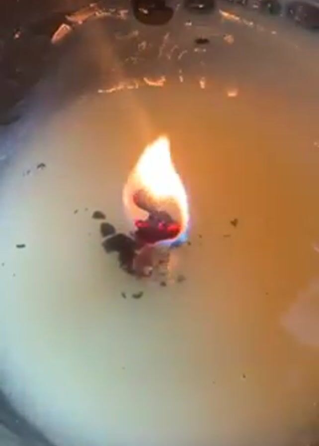 A close-up shot shows a lit candle in a silver container. The candle wax is melted and appears off-white or light yellow. The flame is bright, with a red-orange base and a white top. Small pieces of dark debris are scattered around the base of the wick in the wax. The camera angle is directly above the candle. The background is blurred, but hints of light can be seen, possibly from a light source reflecting on surfaces.