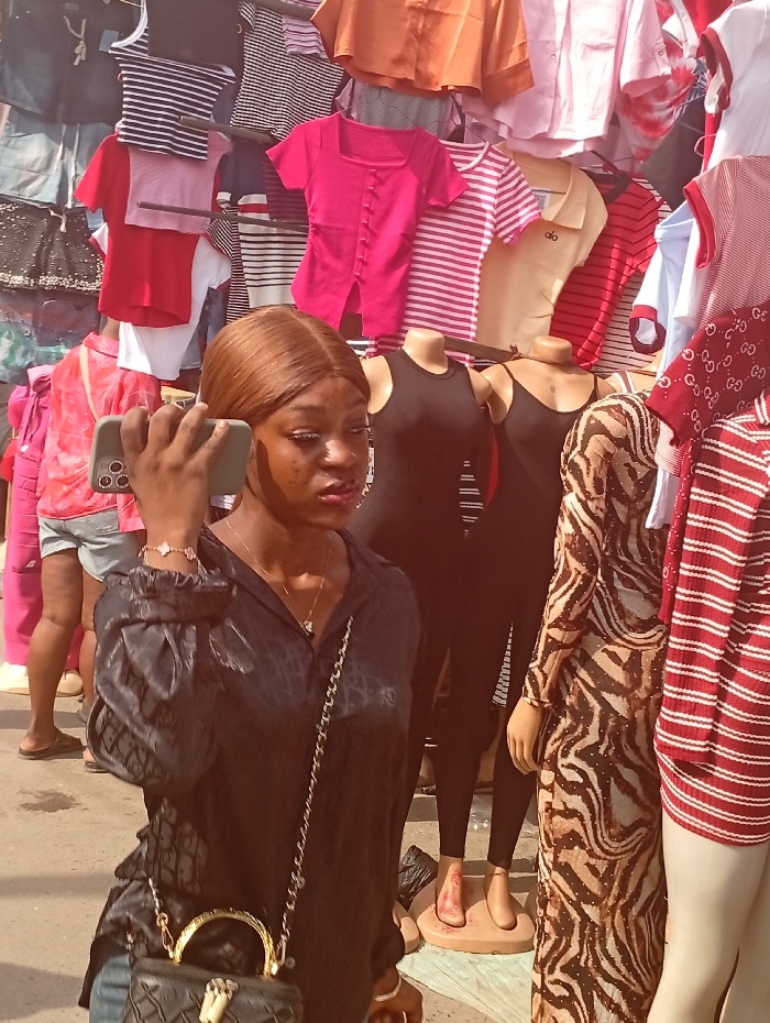 The image captures an outdoor market scene in Fegge, Nigeria. A young adult Black female, with light brown hair, occupies the left side of the frame, holding a light green smartphone horizontally to her right ear. She wears a dark, long-sleeved, subtly patterned blouse, blue jeans, a silver chain necklace, and a four-leaf clover motif bracelet on her right wrist. A black handbag with a gold-colored handle and chain strap is slung over her left shoulder. Behind her, three headless mannequins display clothing: two wear black tank tops, and one wears a long-sleeved brown and black animal print dress. To the right, another mannequin wears a red and white striped top featuring "GUCCI" text and a "GG" logo. Mannequin feet and partial legs are visible at the bottom, one foot missing on a circular base. The background is densely packed with various clothing items hanging on racks and structures, including striped t-shirts, solid-colored blouses in red, pink, yellow, and orange, and shorts. A partially visible individual wearing light-colored shorts and a pink top stands in the far left background. The scene is brightly lit.