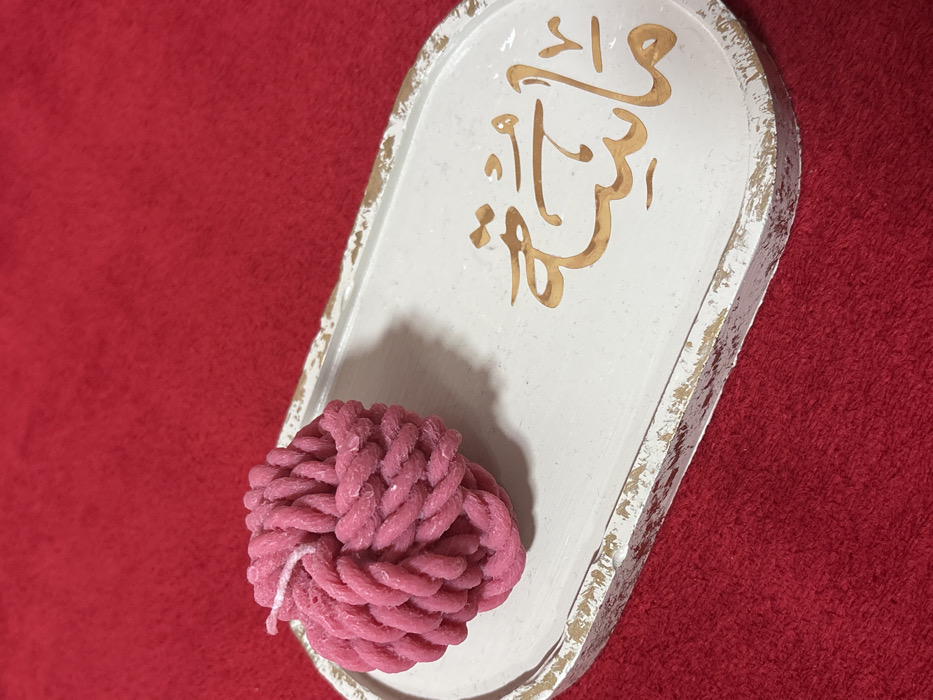 An oval tray, painted white with distressed gold edges, displays Arabic calligraphy in gold paint. A pink, knotted ball rests on the tray's lower left corner. The tray and ball sit on a red fabric surface. The calligraphy is placed at the top of the tray and appears to be the main focus. The overall scene is simple, focusing on contrasting colors and textures.