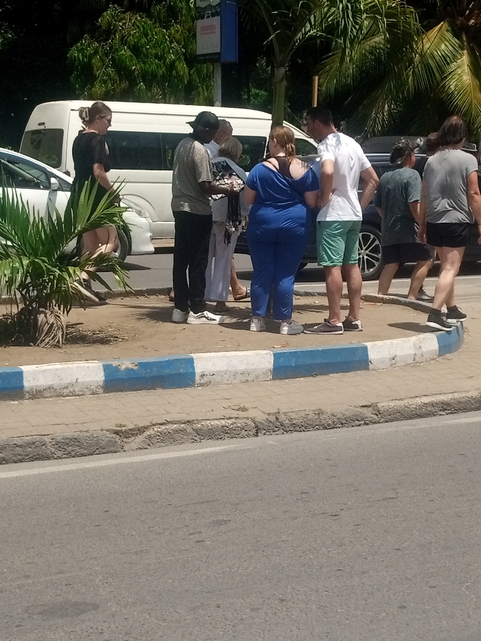The image displays an outdoor scene during daylight hours in Ganjoni/Shimanzi ward, Kenya. A group of seven individuals is gathered on a paved sidewalk next to an asphalt road. In the center, a dark-skinned male, dressed in a striped shirt and dark pants, is engaged in a commercial interaction, displaying several light-colored items (likely textiles or souvenirs) to four other individuals. These observers include: a light-skinned female in a black dress to the left; a light-skinned female in a royal blue off-shoulder top and matching pants, with her back mostly to the camera; a light-skinned male in a white t-shirt and green shorts; and a partially obscured light-skinned female in light-colored attire behind the vendor. To the far right, two additional light-skinned individuals—one male in a dark green t-shirt and dark shorts, and one female in a grey t-shirt and black shorts—are seen moving away from the central group. The background features a white passenger van and the front of a white car on the left, with a dark SUV partially visible behind the group on the right. Lush green tropical foliage, including palm trees, is prominent behind the vehicles. A light pole with a blue sign is visible in the upper center-left. The sidewalk's curb is painted white and blue. The scene is illuminated by bright natural sunlight.