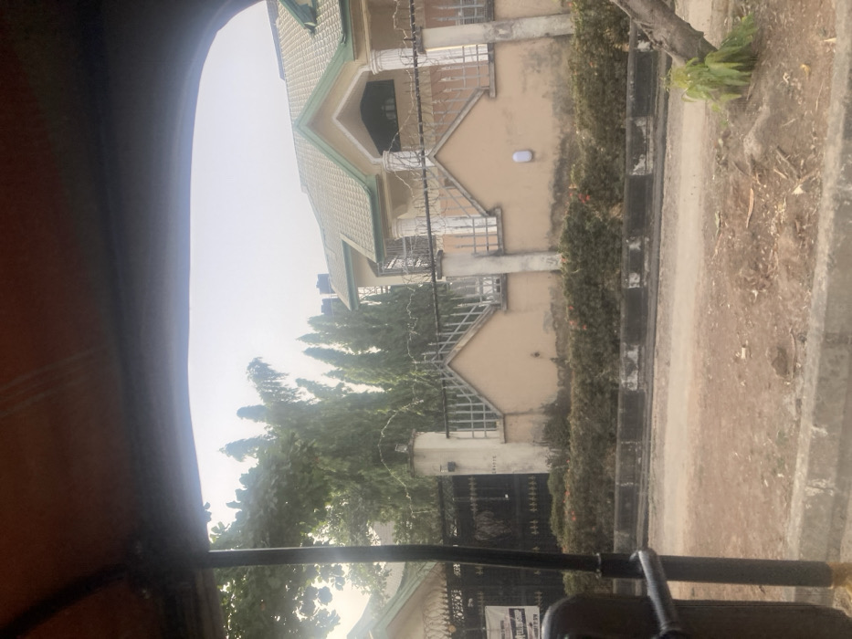 A tan building with a green roof is visible behind a high fence topped with barbed wire. The building features a distinctive gable design and multiple windows. A line of neatly trimmed shrubs runs along the sidewalk in front of the property. The view is partially obstructed by the interior of a vehicle, likely a car or tuk-tuk, framing the scene.