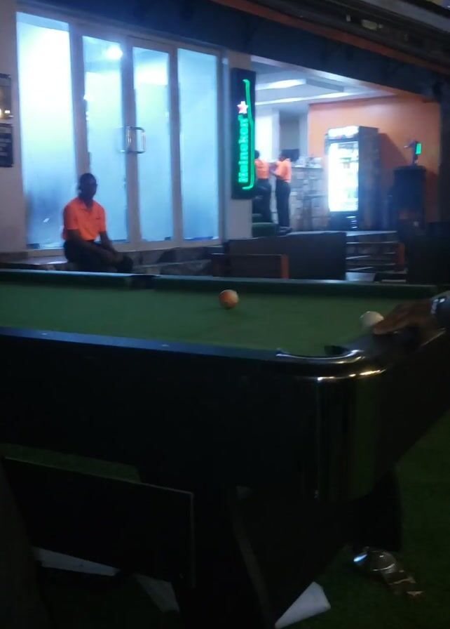 The camera is tilted upward, showing a dimly lit outdoor area with a pool table in the foreground. Two pool balls are visible on the green felt of the table. Behind the table, there's a glass-walled building with a green "Heineken" sign above the entrance. Inside the building, two people wearing orange shirts can be seen. The building appears to be a bar or lounge. Artificial turf is laid on the ground next to the pool table. The overall atmosphere is relaxed and casual.