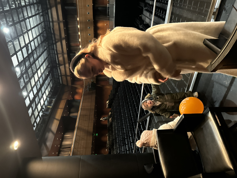An adult blonde female, wearing a cream-colored faux fur coat and a black headband, stands in the foreground, positioned on an elevated viewing platform or balcony within a large, largely unoccupied auditorium or concert hall in Unknown, Russia. She looks downwards and slightly left. To her immediate left, a young child in a dark olive-green winter suit and a light-colored beanie looks upwards with a slightly open mouth, their right arm slightly extended. An orange balloon with white markings rests on the dark floor near this child. To the left and partially obscured by a black armchair, a second child in a light-colored coat and a pink pom-pom hat faces away from the viewer. The background reveals numerous rows of empty, dark upholstered seats sloping downwards towards a distant stage area, marked by dark curtains. A small, indistinct figure is visible standing on the main auditorium floor near the stage. The venue features horizontal metal railings in the mid-ground, wooden paneling on the walls, and a prominent grid-patterned ceiling structure with recessed lighting.