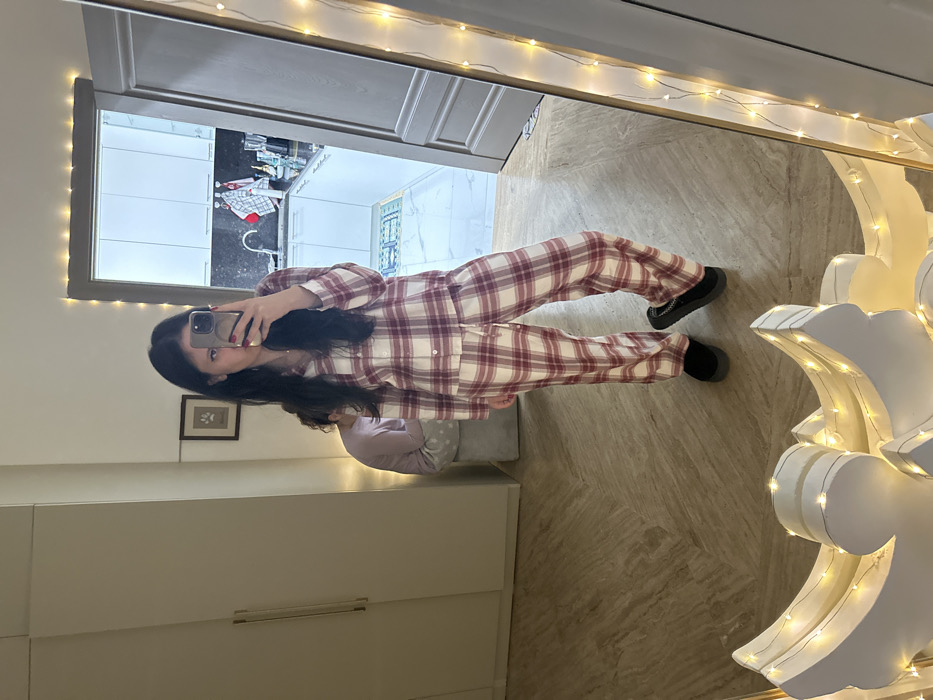 A woman in plaid pajamas takes a mirror selfie. She holds her phone up to capture the image in the mirror. The mirror is decorated with fairy lights, adding a warm glow. Behind her, the blurred background reveals a glimpse of a room with white cabinets and a small framed picture on the wall. The floor has a marble-like pattern. The lighting is soft, enhancing the cozy atmosphere of the scene.