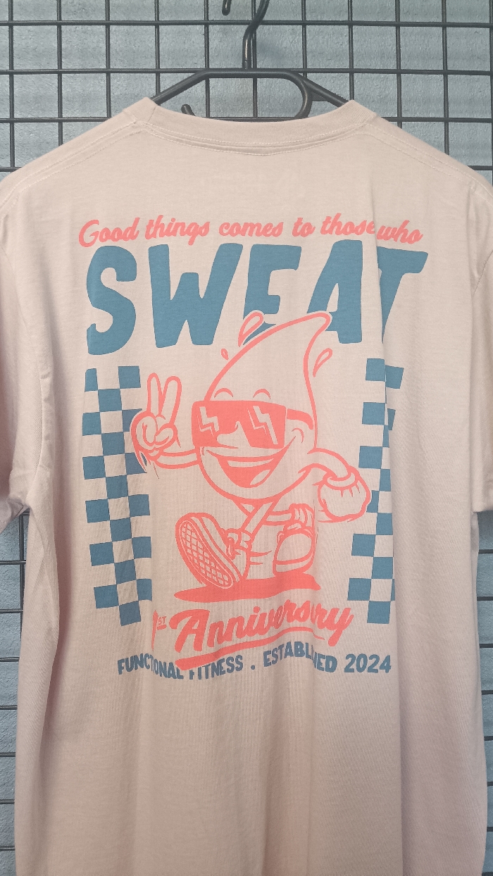 A light pink t-shirt with a multi-color graphic design hangs from a black wire hanger, centered against a dark gray metal grid wall. The t-shirt's design features the coral-red cursive phrase "Good things comes to those who" at the top, followed by the large, bold, light blue word "SWEAT." Below this is a coral-red outlined cartoon character, an anthropomorphic sweat drop, depicted smiling, wearing sunglasses with lightning bolt reflections, a headband, and sneakers, while making a peace sign with its left hand. Flanking the character are vertical checkered patterns in light blue and the t-shirt's base color. The bottom of the graphic displays "1st Anniversary" in coral-red cursive, with "FUNCTIONAL FITNESS . ESTABLISHED 2024" in light blue capital letters beneath it. The garment appears clean and uncreased. This scene is located in Sagunto, Spain.