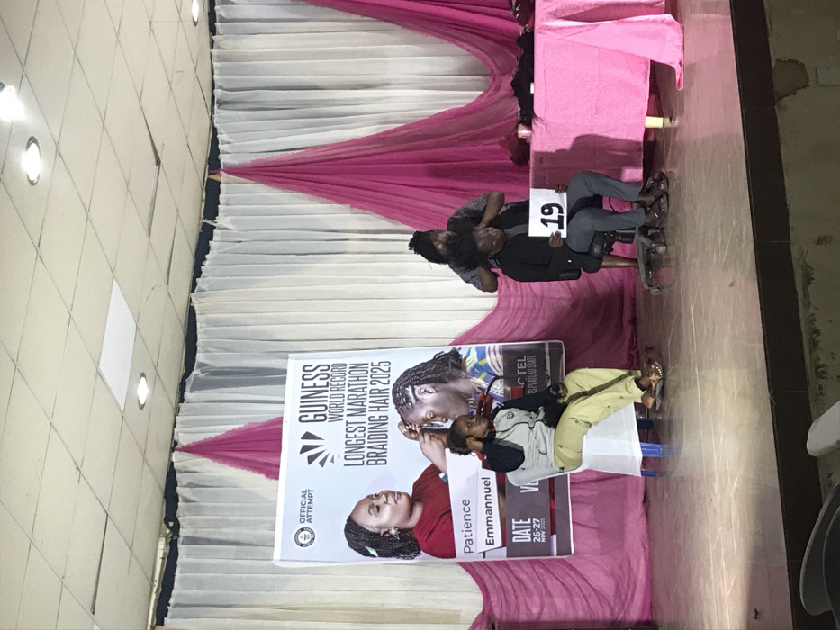 The image depicts a Guinness World Record attempt for the "Longest Marathon Braiding Hair 2025
