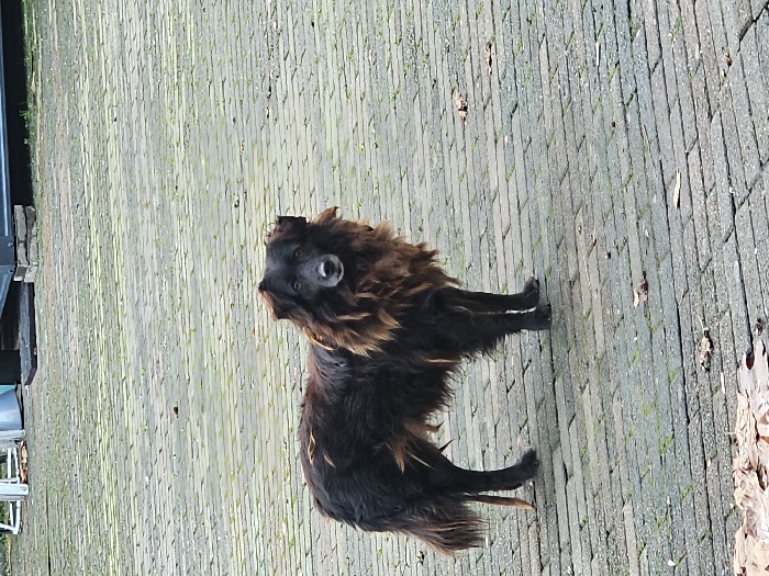 A medium-sized, black and brown dog stands on a paved brick surface with scattered debris. The dog faces slightly to the left, looking directly at the viewer with one eye clearly visible. The dog has long, shaggy fur. The bricks are weathered, with moss in the joints. A dark object is partially visible on the left edge of the image.
