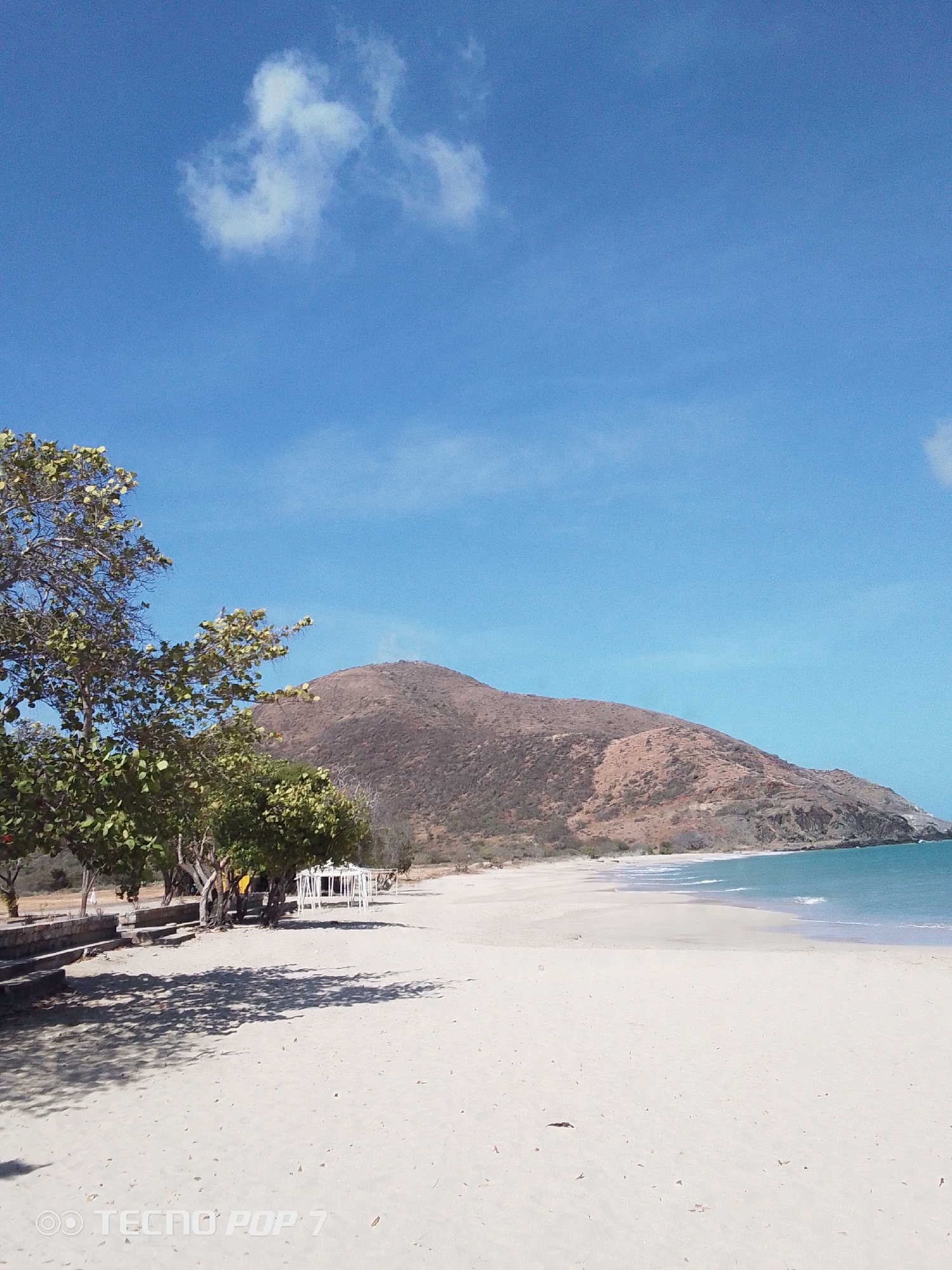 beach scene in Pedro González, Venezuela. The foreground consists of a sandy beach with tree shadows and a few trees, with white structures that appear to be canopies. Beyond the beach is light blue water with small waves. In the background is a large, brown, arid hill. The sky is a clear blue with a few scattered white clouds. A 'TECNO POP 7' watermark is present in the lower left corner of the image.