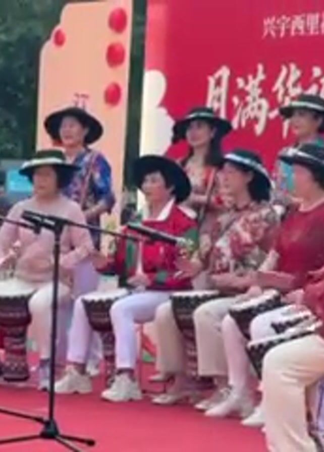 On a stage, a group of nine women are performing music. They are seated in a row, each playing a djembe drum. Most of the women wear hats, and their outfits consist of long-sleeved shirts or blouses paired with white pants or slacks. Microphones stand in front of each woman, suggesting they are singing as well. Behind them is a red backdrop with Chinese characters. Speakers are visible on either side of the stage. The event appears to be taking place outdoors, as trees and people are visible in the background.