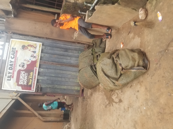 The image displays an outdoor urban scene in Onitsha, Nigeria, identified by a sign for "LILY DAY CARE" at "NO. 17 UKAZONDI STR." A dark, corrugated metal gate, centrally located, bears this large white banner. To the far left, a man wearing a teal sleeveless shirt with the number "33" on the back and dark shorts walks away from the viewer, past two dark buckets on the ground. On the right, a young male in an orange short-sleeved shirt and dark pants sits on a concrete ledge, holding a dark mobile phone to his right ear. In the foreground, two large, irregularly shaped olive-green woven sacks rest on the concrete ground, one appearing partially unrolled. A short, traditional broom and several colorful plastic wrappers are also scattered on the ground. The area is paved with concrete and dirt, showing some damp patches, bordered by light brown-colored buildings.