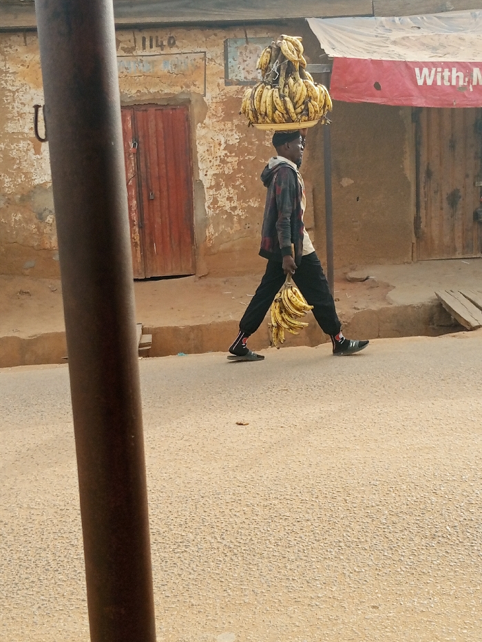 This image captures a street scene in Television, Nigeria, focusing on a male individual engaged in vending. The scene is presented from a slightly elevated perspective, looking down a paved street with a building forming the background. The central subject is a dark-skinned male, observed in profile, walking from left to right across the frame. He wears a dark, possibly plaid or patterned, hooded jacket over a lighter-colored garment, dark trousers, and dark sandals worn over socks with red accents. He is carrying a significant quantity of ripe, yellow bananas. A large, conically stacked arrangement of bananas rests on a light-colored, circular tray balanced on his head. Concurrently, he holds several additional bunches of bananas in his left hand, suspended at his side. His head is turned slightly forward. The background consists of a single-story building with a light brown, visibly weathered facade exhibiting areas of peeling plaster or paint. To the left, a reddish-brown, vertically paneled double door is present. Above this door, the number "1140" is painted in blue. Further right, a second reddish-brown door with horizontal panels is partially visible beneath a red fabric awning, which displays partially obscured white text, "With M". The ground immediately adjacent to the building appears to be an unpaved, earthy surface, separating the structure from the concrete or asphalt street. The street surface itself is a light tan, textured pavement. In the extreme foreground, occupying the left side of the image, is a thick, dark brown, cylindrical pole, partially obscuring the view of the street and the left side of the building.