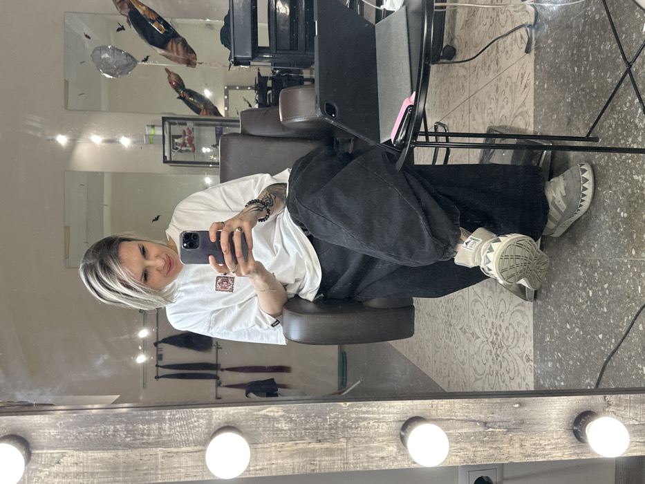 A female individual is depicted in a reflection within a salon or beauty studio in the city of Ovoshchnoy, Russia. She is seated in a brown upholstered salon chair, facing forward, holding a dark-colored smartphone with both hands, angled towards herself as if taking a selfie or viewing the screen. Her expression is a slight smile. She has short, light-colored hair with darker roots and highlights. She wears an oversized white t-shirt with a small square emblem on the chest, dark baggy pants, and light-colored sneakers with a distinct serrated pattern on the soles/sides. Her left foot is propped on her right leg, exposing the sole of the shoe. A beaded bracelet adorns her left wrist, and a tattoo is visible on her left arm. Rings are present on her right hand. To her right, a black round table holds an open black tablet with a gray cover, on which a pink highlighter or pen rests. The immediate environment visible in the reflection includes a large, vertically oriented mirror framed with rustic wooden planks and featuring multiple exposed spherical light bulbs on its left side. In the background of the reflection, other salon elements are visible: a rack displaying various hair extensions, a shelving unit with products, and a second mirror. Seasonal decorations are present, including two foil balloons (one silver, one brown/orange shaped like a witch's hat or boot) and several small black bat cutouts adhered to the wall or mirror surfaces. The flooring is tiled with a light-colored, intricate pattern.