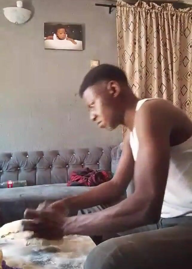 medium shot of a young man sitting in a room, working with dough on a marble table. The man is wearing a white tank top and dark pants. He appears to be stretching, kneading, and shaping the dough. Behind him is a gray tufted sofa, and on the wall is a picture of a baby. A bottle of soda sits on the sofa. The room appears to be simply furnished, with a lamp, curtains, and neutral paint on the walls. Music is playing in the background.