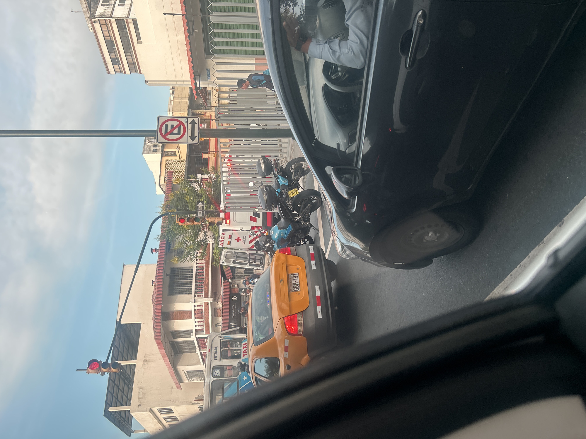 The image was taken from inside a car in Guayaquil, Ecuador, showing an urban traffic scene. In the foreground, the interior of the car is visible, including the dashboard and the driver. Outside the car, there is a yellow taxi with the license plate GBH-191. Behind the taxi, an ambulance is present, and a blue motorcycle is parked nearby. On the left side of the image, there are buildings with red tile roofs, and a no-parking sign is visible on a pole. The traffic light in the background is red. A person is walking on the sidewalk near the fence.