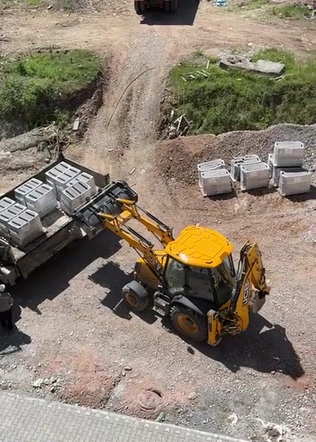 The scene is a construction site viewed from above. A yellow JCB backhoe loader is shown moving pallets of grey concrete blocks from a flatbed truck to a storage pile on the ground. A worker is standing near the flatbed truck. A dump truck sits further away, parked on a dirt path. The ground is a mix of dirt, gravel, and patches of green grass and shrubbery. A paved sidewalk is visible at the bottom of the frame.