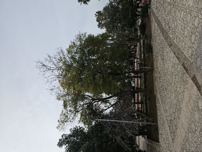 The image depicts a public park scene within the Jardin Cyber Parc Arsat Moulay Abdeslam in Marrakesh, Morocco, under an overcast sky. The foreground features a light-colored, geometrically patterned paved pathway with a darker, narrower strip running diagonally through it. Beyond the paving, the mid-ground is dominated by a dense arrangement of mature trees and shrubs; a tall tree with primarily green foliage stands prominently in the center, flanked by other trees, some with full canopies and one to the left displaying sparser, potentially deciduous, branches. A slender, dark-colored lamppost is positioned on the left side of the paved area, partially obscured by foliage. In the far background, additional park elements are visible, including more trees and low-lying structures. Two individuals are partially visible on the far right edge of the frame; one is seen from behind, wearing a light-colored, patterned top and dark lower garments, while the second is less distinct and partially obscured behind the first. The overall lighting is diffused, consistent with an overcast daytime sky, and no strong shadows are present.