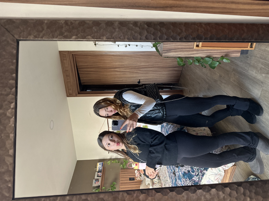 Two women are reflected in a large mirror. The woman at the top wears a white shirt with a black vest, black leggings, and black boots. She holds a phone. The woman below wears a black sweater, black leggings, and grey boots. The mirror has a patterned, brown frame. The background includes a wooden door, a wooden shelf with a plant, and a bed with a patterned comforter. The walls are light beige. The floor is wood.