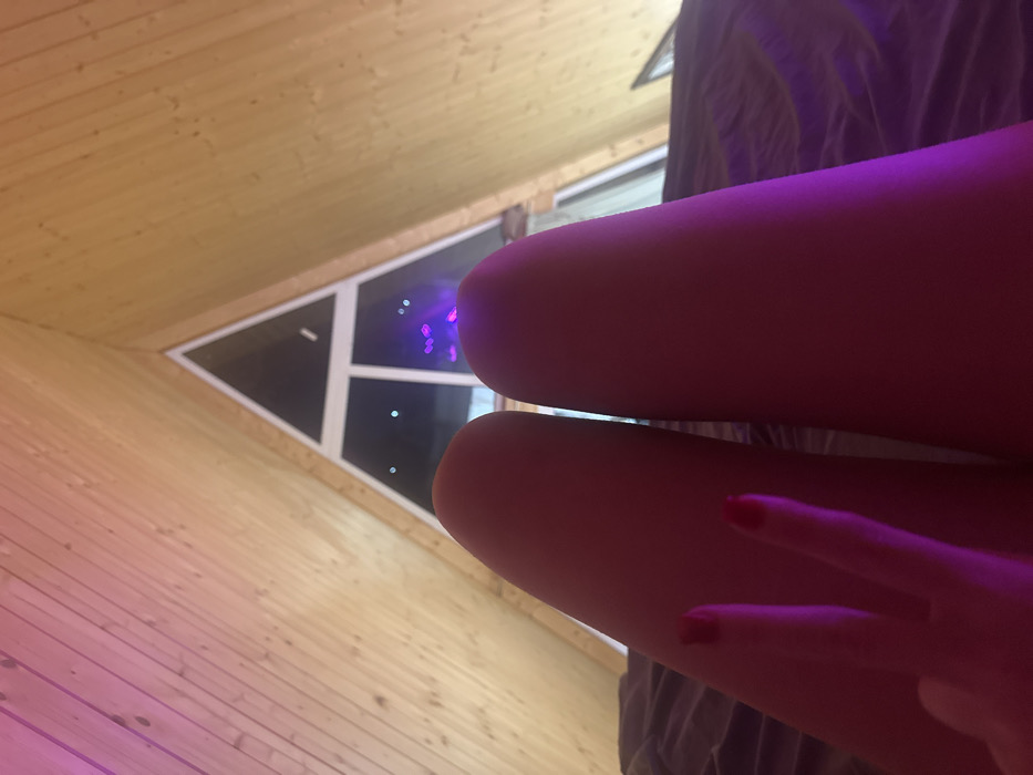 An upward-angled shot shows a wood-paneled interior with a triangular window. The window reflects a purple glow. In the foreground, a person's legs are visible, one resting above the other. The legs are illuminated with the same purple hue, and a hand with painted fingernails displays a peace sign. A gray, textured fabric is partially visible to the right.